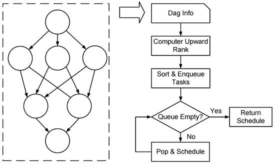 Topcuogl et al. [4] proposed the heterogeneous earliest-finish-time (HEFT) algorithm. Figure 6 illustrates the process of HEFT list scheduling. The principle of HEFT is to calculate task priorities and arrange them in descending order. For each task, a processor that can achieve the earliest completion time and consider communication overhead is selected to achieve efficient task-scheduling optimization in a heterogeneous environment. Bittencourt et al. [20] proposed a variant of the HEFT algorithm, which prioritizes the task by calculating the average execution time and communication cost of the task on each heterogeneous chip processing unit when making the scheduling decision, and considers the subsequent sub-tasks of the task through the foresight mechanism to achieve the overall optimum. The static scheduling algorithm calculates the optimal or approximately optimal scheduling scheme in advance, thus reducing the time overhead of decision-making when the system runs and ensuring that tasks are performed on a strict schedule. However, in the static task-scheduling direction, most existing algorithms have disadvantages such as unbalanced task allocation and too long of a total task execution time [21].
