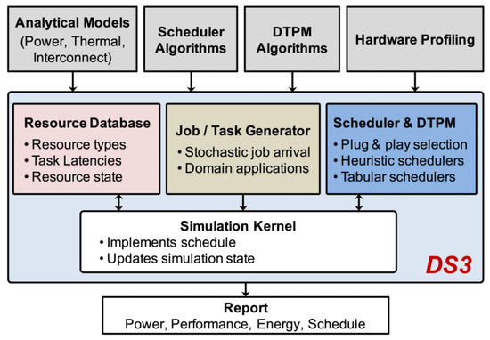 - Arda, S.E.; Krishnakumar, A.; Goksoy, A.A.; Kumbhare, N.; Mack, J.; Sartor, A.L.; Akoglu, A.; Marculescu, R.; Ogras, U.Y. DS3: A system-level domain-specific system-on-chip simulation framework. IEEE Trans. Comput. 2020, 69, 1248–1262. [Google Scholar] [CrossRef]