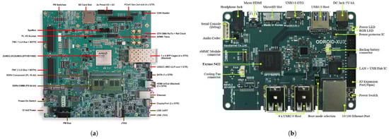 Common hardware-in-loop, such as the Xilinx Zynq UltraScale + ZCU102 FPGA (a) and Odroid-XU 3 board (b).