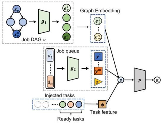 The future development direction of the heterogeneous chip task-scheduling algorithm will move towards the direction of intelligence and adaptive optimization, among which deep integration with reinforcement learning is a key trend. Figure 9 describes the overall DeepSoCS network structure based on reinforcement learning. DeepSoCS simulates the interaction between the environment and the agent and constantly optimizes the scheduling method, which can dynamically adapt to the complex and variable resource states and task requirements in the heterogeneous chip system [63]. Compared with the traditional scheduling algorithm based on heuristic or static rules, the reinforcement learning method can perform online learning and real-time decision-making and can optimize strategies according to feedback in the operation, effectively improving the efficiency of task allocation and resource utilization. In addition, reinforcement learning algorithms can achieve global optimization in multi-task and multi-constraint heterogeneous environments through experience accumulation and policy migration, providing more flexible, efficient, and robust solutions for complex scheduling problems. However, heterogeneous chips have different processing units for computing power, memory bandwidth, power consumption, and other characteristics. Therefore, reinforcement learning algorithms must be able to choose appropriate task-scheduling strategies under these resource constraints. The state space needs to contain information such as load situation, data dependency, and task priority. In contrast, the action space includes the allocation mode of different tasks, such as the division and scheduling of tasks between different processing units. The reward function must be designed according to the task completion delay, resource utilization rate, load balance, and other indicators to promote the reinforcement learning model and learn the optimal scheduling strategy in the training process. Due to the complexity of the task-scheduling problem, reinforcement learning training may face high-dimensional state space and long training periods, leading to sample inefficiency and time overhead in the exploration process.