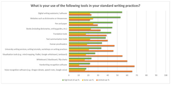 Wordtune users draw on multiple tools and types of support to write in addition to Wordtune, confirming the idea of the digitisation of writing (Figure 2). Translation tools appeared high up the list of other writing supports used, although not among native English speakers (ρ = −0.360, p < 0.001). Voice/handwriting recognition software was not used much, especially among those with better English language levels (ρ = −0.131, p = 0.036). But respondents also acknowledged using books and pen and paper to support the writing process.