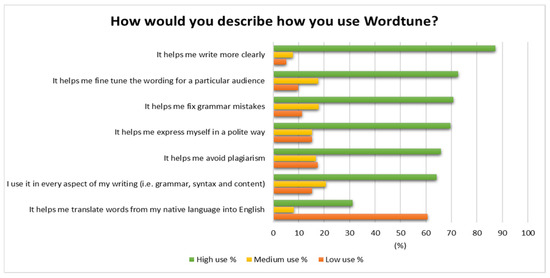 The main uses that respondents acknowledged are set out in Figure 3. Writing more clearly and correcting grammar scored highly. The high scores for writing for an audience or expressing oneself in a polite way probably relate to selecting tone, which is central to Wordtune’s functionality. However, such benefits seemed negatively correlated with the level of English confidence; in fact, the more fluent the users are in English, the less important these aspects appear to be (e.g., ρ = −0.274, p < 0.001 for “It helps me express myself in a polite way”). Avoiding plagiarism was also acknowledged as an important use. Taught students emphasised this more than other users, as one might expect, but, interestingly, academic staff also mentioned this as a use too. Although Wordtune has a translation function, this did not seem to be used much, perhaps because there are other more specialised tools for translation. This suggests that users are quite discerning in how they apply Wordtune alongside other tools.
