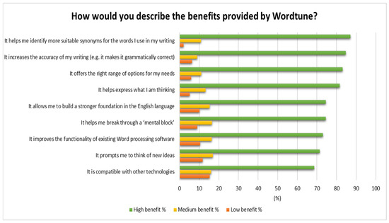 Figure 4 represents what respondents identified as the benefits of Wordtune. The response was positive with respect to all the benefits listed in the questionnaire. The most strongly supported benefits included obvious aspects given its functionality, such as finding synonyms, but also less obvious uses that leverage this, such as breaking a mental block or thinking of new ideas (Figure 4).