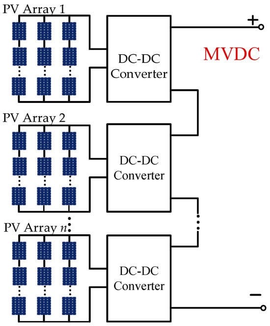 Photovoltaic DC collection systems are usually applied in medium-voltage-distributed PV power generation scenarios. According to the insulation requirements, the output voltage of PV arrays is usually designed to be no more than 1 kV, while the medium-voltage direct current (MVDC) scenarios are usually 10 kV or 35 kV, so for the photovoltaic DC collection system, a high boost ratio photovoltaic DC boost converter is the key to the system. The IIOS-type photovoltaic DC collection system shown in Figure 1 is a suitable choice, which realizes independent maximum power point tracking (MPPT) by connecting PV cells at each input port. The output series structure achieves a high boost ratio, which meets the needs of a photovoltaic DC collection system in medium-voltage environments.