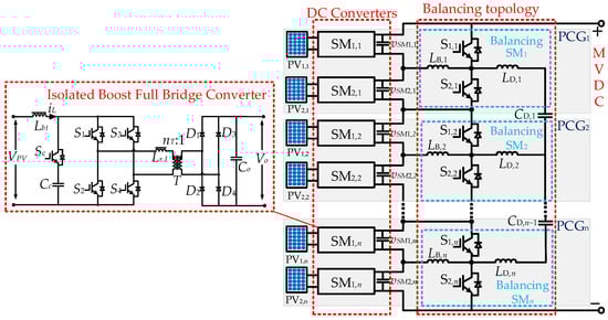 With the continuous growth of photovoltaic (PV) installed capacity and the increasing share of power generation, along with advancements in power electronics and flexible DC transmission technology, DC aggregation is expected to replace traditional AC grid connection methods, becoming a key approach for PV power generation integration [1]. Due to their low power density, PV arrays often require a boosting and aggregation system to achieve reliable grid connection [2,3]. Currently, DC pooling technologies are mainly based on two cascade topologies: input-independent output-series (IIOS) and input-parallel output-series (IPOS) [4,5]. The IIOS-type topology indicates that each PV array is connected to the grid through independent inputs, and then the outputs are connected in a series after boosting, while the IPOS-type topology has inputs connected in parallel and outputs connected in series. Pure IPOS does not allow for all the PV panels to operate at the maximum power point, and it is necessary to add a first-stage converter for all the PV arrays to realize their own independent maximum power point tracking (MPPT) prior to pooling. The IIOS topology offers significant advantages over IPOS, including independent MPPT on the input side and a high boost ratio on the output side. This architecture is particularly suited to photovoltaic DC collection systems in medium-voltage environments, as it reduces system costs, eliminates the broadband oscillation issue of multiple inverter cascades, and offers higher efficiency and stability [5,6,7]. Moreover, to mitigate fluctuations in PV output and improve a voltage imbalance due to a power mismatch, IIOS-type photovoltaic DC systems with additional balancing modules have been proposed [8,9]. These systems can transfer mismatched power between PV modules, equalizing output voltage and enhancing system efficiency. However, the addition of balancing modules increases the number of switching devices, and studies show that the probability of damage to power devices in power electronic converters can be as high as 21% [10]. Furthermore, with the growing number of sub-modules (SMs), the likelihood of fault occurrence increases, making the fault diagnosis of SM switching devices critical for enhancing system reliability.