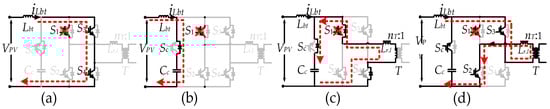 In this paper, IBFBC is used to realize independent MPPT control of each SM in steady-state operation, in which S1, S3, and S4 form a controllable full-bridge circuit with power switching tubes S1, S2, S3, and S4; T is a high-frequency AC transformer; Lr is its leakage inductance; D1, D2, D3, and D4 are uncontrolled full-bridge rectifier diodes; Co is the output filtering capacitance; and IBFBC has the advantages of galvanic isolation and high step-up ratio, and it is very suitable for photovoltaic DC collection systems that require galvanic isolation and have a high-voltage DC bus during the system. In this paper, the IBFBC was used to realize the independent MPPT control of each SM, and in the steady-state operation, the duty cycle of switching tubes met 0.5 < D < 1.0, in which the S1 and S4 conduction signals were the same, and the conduction signals of S2 and S3 had a 180° phase difference with S1 and S4, and Sc was delayed to conduction only in the diagonal tube conduction of the bridge arm. Reference [23] describes the working principle of the IBFBC in more detail, which will not be expanded in this paper.