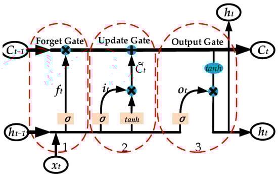 LSTM is a special kind of recurrent neural network (RNN) for processing sequence data, which solves the problems of gradient vanishing and gradient explosion of traditional RNNs in processing long sequences by introducing memory units and gating mechanisms, and is able to capture long-term dependencies better [25]. Its model architecture is shown in Figure 5. The LSTM model dynamically adjusts the information flow by introducing forget gate, update gate and output gate, thereby effectively extracting the temporal features of time series data. Its main steps are as follows: