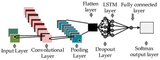 LSTM has deficiencies in local feature learning and is difficult to effectively extract fault features, while CNN cannot capture the temporal characteristics of SM faults. The CNN-LSTM model combines the advantages of CNN in feature extraction and the strengths of LSTM in time series data processing. By combining the convolution layer with the LSTM layer, the prediction model can extract significant features from the original data and capture the temporal features hidden in the historical trend. The CNN-LSTM fault diagnosis model constructed in this paper is shown in Figure 6. The model consists of an input layer, a convolution layer, a pooling layer, an LSTM layer, a fully connected layer, and an output layer. Among them, the pooling layer down-samples the output vector of the convolution layer, which is equivalent to secondary feature extraction. In order to optimize the performance of the model, a random dropout layer (Dropout) and a Flatten layer are added on this basis. The Dropout layer is used to solve the common overfitting problem in deep neural networks and improve the generalization performance of neural networks [26]. The Flatten layer is used to adjust the data format to the input format required by the LSTM layer. The fully connected layer is used to integrate and classify the extracted features.