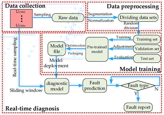 This paper selects the SM capacitor voltage as the raw data for open-circuit fault diagnosis, and combines the model theory in the previous section to propose a CNN-LSTM-based open-circuit fault diagnosis method. The model construction process is shown in Figure 7, which mainly includes data acquisition, data preprocessing, model training, and real-time diagnosis, which will be discussed below.