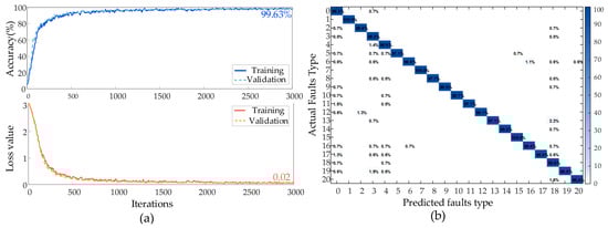 The model was trained and tested using the collected sample set, and the accuracy of the diagnostic model reached 99.63%. The training progress curve is shown in Figure 9a. It can be seen that the model has a good learning effect, fast convergence speed and robustness. The verification accuracy is close to the training accuracy, indicating that the model performs consistently on different datasets, and the loss value has not increased significantly, indicating that the model is not overfitting. During the entire training process, the loss value of the model continued to decrease, indicating that the model is constantly learning and optimizing. Figure 9b is the confusion matrix of the diagnostic accuracy, which shows the percentage of classification results obtained after cross-validation of the final dataset. The classification of each fault type in the figure is mainly concentrated on the diagonal, which shows that the model has excellent fault diagnosis performance.