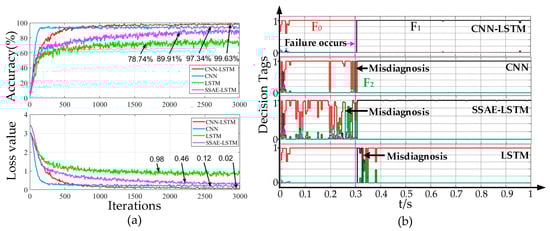The results show that CNN has the fastest convergence speed, the highest accuracy, and the model performance is relatively stable; LSTM has a slower convergence speed, and the convergence effect of the model is poor as the number of iterations increases; adding the stacked sparse autoencoder (SSAE) network to automatically extract fault features increases the accuracy to 89.91%, but SSAE has poor feature extraction effect on the fault information; in contrast, CNN-LSTM not only ensures the convergence speed and accuracy of the model, but also has smaller random fluctuations and loss values in the iteration process. Subsequently, a real-time diagnosis comparison analysis is performed through simulation, and the results are shown in Figure 10b. As can be seen from the figure, although the CNN model has a slightly faster diagnosis time, it has a misjudgment phenomenon due to the lack of global timing dependence; LSTM directly has an erroneous judgment, indicating that the model has not learned local fault features; adding SSAE-LSTM, the diagnosis time becomes longer, but misjudgment occurs in the normal state, indicating that the model has not extracted the fault features well; and the CNN-LSTM model in this paper has a slightly slower time than the CNN model, but its diagnosis accuracy is high, the classification effect is good, and there is no misjudgment.