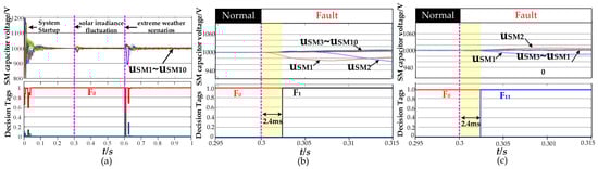 The trained model is deployed in Simulink for a real-time fault diagnosis simulation. The SM capacitor voltage data are collected in real time, processed by sliding windows, and then input into the deep learning toolbox to load and call the trained model interface file, and output the fault decision label. Figure 11a shows the graphs of SM capacitor voltages and model-determined labels during normal operation of the PV DC collection system after normal startup and addition of PV fluctuations. At 0.3 s and 0.6 s, the light intensity of SM1 is reduced by 10% and 100%, respectively, to simulate the shading situation of the PV plant and the extreme weather scenarios. At this time, the SM capacitor voltage fluctuates and the voltage balance is achieved by the balancing module. The diagnostic decision label of the model always outputs F0, which indicates that the diagnostic model does not make wrong decisions due to the variation of normal light intensity. The output of the model’s diagnostic fault type fluctuates during system startup and in extreme weather, but still the probability of F0 is the highest and no misjudgment occurs. This shows that the model has excellent diagnostic results in different environments.