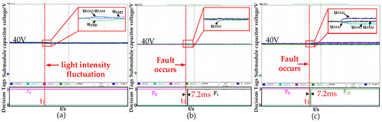 Figure 13a shows the experimental waveform when the current given value is reduced by 10% at time t1, simulating a change in light intensity while the DC collection system operates normally. As shown, the SM output voltage fluctuates but is quickly stabilized by the balancing module. The decision output from the diagnostic model remains F0, indicating no fault detection, and no misjudgment occurs.