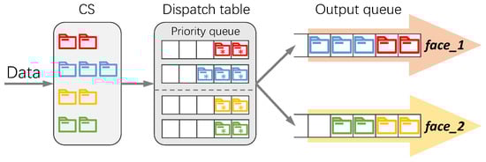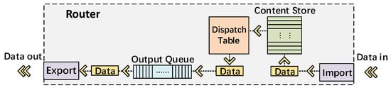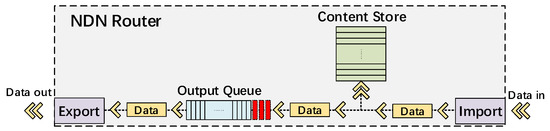 NDN relies on the pull model to acquire content, where the user sends explicit requests referred to as “Interest” to pull the named content referred to as “Data”. Each request message contains the name of the desired content and is forwarded by routers according to the name to retrieve the corresponding content from sources or in-network caches [14]. Each Interest will retrieve one Data, and the Data are reverse-forwarded along the path specified by the Interest. After receiving the Data, the router stores its copy in the Content Store (CS) and immediately forwards the Data. This means that the Data will be inserted into the output queue of the forwarding interface, as shown in Figure 1.