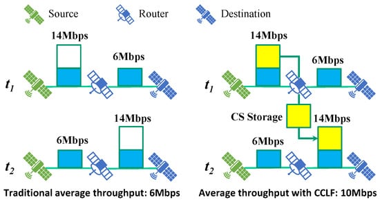 In LEO satellite communications, the available bandwidth frequently fluctuates due to varying conditions. By leveraging the contact windows provided by satellite communication, we can model the time-varying network as a sequence of segmented static networks. Specifically, when the available bandwidth of the upstream link exceeds that of the downstream link, CCLF leverages the CS to store Data packets that cannot be immediately forwarded due to bandwidth limitations. Once the available bandwidth of the downstream link increases, these previously stored Data packets can be promptly forwarded, thereby enhancing the overall throughput of the network. This mechanism ensures efficient use of available bandwidth and minimizes delays, as illustrated in Figure 4.