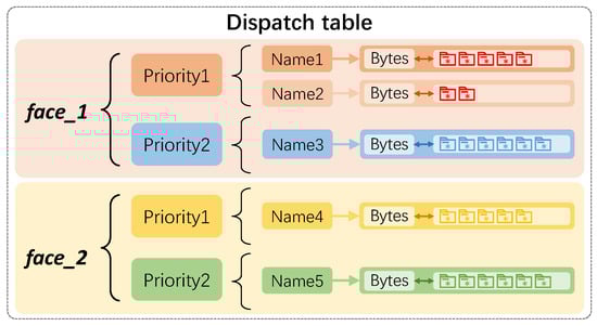 The main improvement introduced by the CCLF is the creation of a dispatch table within NDN routers to assist in making forwarding decisions. This dispatch table maintains detailed records for each Data packet stored in the CS that has not yet been forwarded. When the final Data packet in the output queue is transmitted, the dispatch table is consulted, and the next Data packet to be forwarded is selected based on a priority-based scheduling algorithm. This selected Data packet is inserted into the output queue and immediately forwarded, and the next Data packet is then selected, as illustrated in Figure 3. By scheduling Data forwarding based on the current status of the output queue and the priorities of data flows, the CCLF method achieves maximum throughput while ensuring congestion-free forwarding and reducing the flow completion time.