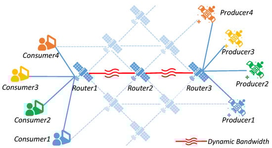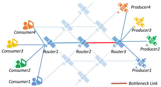 However, when the traffic of Data packets waiting to be forwarded exceeds the link capacity, these Data packets accumulate in the output queue, leading to queue overflow and packet loss. This issue is prominent in LEO satellite networks due to their dynamic available bandwidth. In this paper, the term “bandwidth” is employed to denote the maximum data transmission rate of a link, reflecting the link capacity for data transfer. The substantial space propagation delay and queuing delay result in a significant increase in data acquisition delay, especially during retransmission triggered by packet loss. Therefore, designing an effective congestion control scheme in NDN to achieve low transmission delay, high throughput, and lossless forwarding is of great significance.