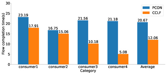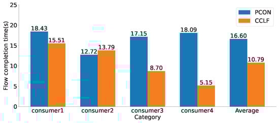 The results indicate that, when using the PCON method, the flow completion time is only related to the content size. The FCT of Flow 1, Flow 3, and Flow 4, which all transmit the same amount of data, exceeds 21 s each. However, using the CCLF method, the FCT of Flow 3 and Flow 4 with high priority is reduced to 10.18 s and 5.08 s, respectively. Notably, using the PCON method, the average FCT of the four flows is 20.67 s, while using the CCLF method, it is reduced to 12.06 s, representing a 41% reduction compared to PCON.