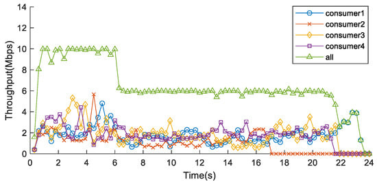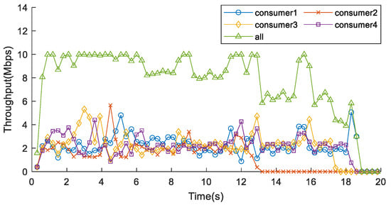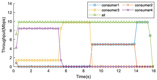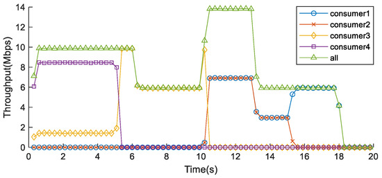 Using the CCLF method, Figure 16 shows that, initially, Flow 4 with the highest priority and Flow 3 with the second-highest priority occupy Link 1. After 5.08 s, all Data packets of Flow 4 are transmitted, allowing packets of Flow 3 buffered in the CS of Router 2 to fully utilize the available bandwidth of Link 1. By 10.18 s, Flow 3 transmission completes, and then Flow 2 and Flow 1, with equal priority, share the available bandwidth equally for data forwarding. Flow 2 completes transmission at 15.06 s, and then Flow 1 occupies the entire bandwidth. Notably, the overall network throughput under the CCLF method remains consistently at a high level.