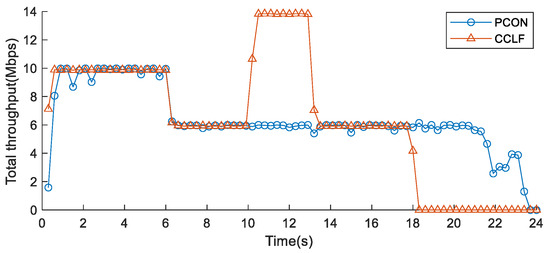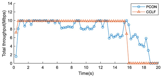 We use total network throughput as an indicator to evaluate bandwidth utilization. Figure 18 shows the total throughput of congested Link 1. Compared with CCLF, dynamic bandwidth cannot be fully utilized when using the PCON method, as is evident from the 10th to the 14th second.