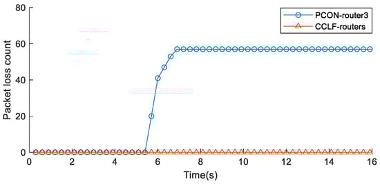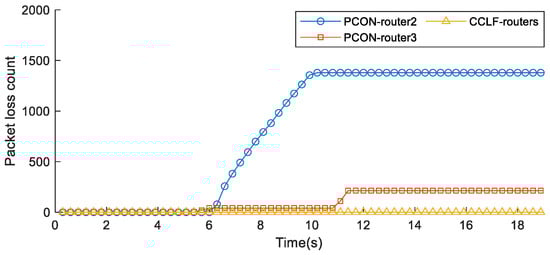 Figure 19 demonstrates that the PCON mechanism fails to quickly alleviate congestion during a sudden traffic surge, resulting in packet losses across multiple routers. In this experiment, the PCON method leads to a total of 1592 packet losses within 12 s. By contrast, the CCLF method ensures zero packet losses across all routers.