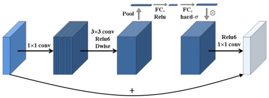 The inverted residuals structure is introduced, and the nonlinear activation function after convolution is replaced with a linear activation function, making the layer structure more efficient. A lightweight attention module based on SENet is incorporated into its bottleneck structure. The specific architecture is shown in Figure 2 [13,14,15]. The SENet attention module is placed after the depthwise convolution in the expansion module, with the aim of maximizing the expressive power of the attention module and enhancing feature extraction capabilities.