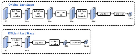 The MobileNetV3 network uses 1 × 1 convolution to construct the final layer of the network in order to increase the dimension of the feature matrix and make the features more abundant, but this will increase the computational complexity. Therefore, performing mean pooling on the features after 1 × 1 convolution not only preserves the high-dimensional information of the image but also reduces computational complexity and latency. The schematic diagram of the final stage of network modification is shown in Figure 3.