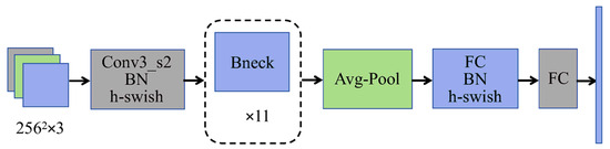where is the output of the corresponding layer in the network. MobileNetV3 can be divided into the MobileNetV3-large model, which is suitable for high-resource environments, and the MobileNetV3-small model, which is designed for low-resource environments. The overall structure of both large and small models is the same, with the key differences being the number of basic units (Bneck) and internal parameters, primarily the number of channels. This research aims to design a lightweight network with low computational cost and faster testing speed; thus, improvements are made based on the MobileNetV3-small model [17].