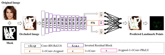 The first 13 convolutional layers use 11 bottleneck (bneck) structures to extract features and accelerate the network speed. The next 10 convolutional layers compress the extracted feature maps. The final layer of the network is a fully connected layer that merges the processed feature maps and maps them to the sample image, thereby outputting the facial landmarks of the occluded image. The specific structure of the improved facial landmark prediction network is shown in Figure 5. In the figure, c represents the output channel number, k is the kernel size, s is the convolution or deconvolution stride, p is padding, f is the dilation factor, and n is the number of repetitions.