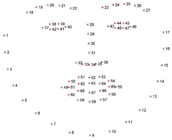 Figure 6 shows the 68 facial key points annotated by the prediction network. Among these, there are 10 key points for the eyebrows, with 5 points uniformly sampled from the left to the right boundary of each eyebrow. The eyes have 12 key points in total, with each eye having 6 points uniformly sampled from the left and right boundaries and the upper and lower eyelids. The lips comprise 20 key points, with 2 points at each corner of the mouth, 5 points uniformly sampled along the outer boundary of the upper and lower lips, and 3 points along the inner boundary. The nose has 9 key points, with 4 points along the bridge of the nose and 5 points uniformly sampled at the tip of the nose. The facial contour is represented by 17 uniformly sampled key points.