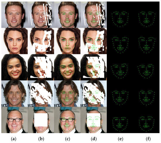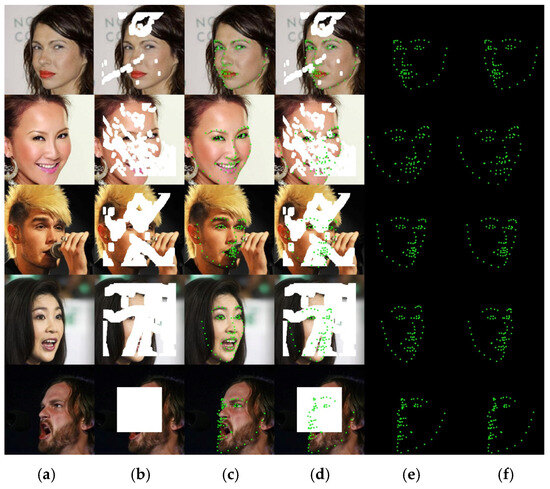 Figure 7 shows the experimental comparison of the model’s prediction of facial landmarks on the original image of a frontal face and four types of mask occlusions. The first row of the mask in the image accounts for 10–20% of the image, the second row accounts for 30–40%, the third row accounts for 40–50%, the fourth row accounts for 50–60%, and the fifth row is the central mask that accounts for 25%. The landmarks predicted by this model are the positions of key facial parts (eyebrows, eyes, nose, lips, facial contours), so when non-predicted facial areas (such as face and forehead) are obscured, it does not affect the prediction effect. As shown in the first, second, and third rows of the figure, when the occlusion area of the key part is small, the predicted landmark positions are basically consistent with the real landmark positions. The difference is that the first row predicts the right eye, the second row predicts the mouth, and the third row predicts the eyebrow landmark positions with some changes. As the occlusion area of key parts increases, the predicted positions of various organ landmarks change to some extent compared to the original image, such as the eyebrows, lips, and facial contours predicted in the fourth row, and the eyebrows, lips, and nose predicted in the fifth row. From the prediction results of different occlusion situations, it can be seen that although the predicted landmarks of each organ have certain deviations from the original image, the overall structure maintains the topological structure between facial organs, and the predicted landmarks basically restore the facial expression information of the original image.
