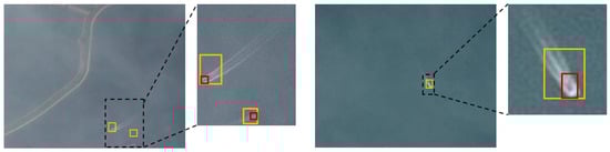 Figure 14. Examples of false positives and false negatives in DPCSANet testing. The red mark indicates false positives caused by cloud interference and ground structure classification errors. Yellow indicates missed detection, i.e., false negative. Some small ship targets were not detected due to their limited size and weak feature representation. - False negative: False negatives mainly occur when the ship target is very small, as shown in Figure 14. When the target is smaller than 16 × 16 pixels or even smaller, its limited feature representation and weak texture information make it difficult for the model to detect. In fact, in many cases, even human observers find it challenging to directly detect these small targets. The presence of stern currents may be the only visual clue to determine their location. This highlights the challenge of detecting small objects in complex backgrounds, as models may struggle to distinguish targets from surrounding noise.