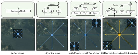 In optical RSIS, the relative position and other feature information of small ships are easily lost during the downsampling process of feature extraction. In addition, in the subsequent feature fusion process, target features may be confused with the background features, which is not conducive to small object detection. Traditional CNNs focus on local features (Figure 3a) but struggle with background information, while self-attention mechanisms emphasize global context over target-specific features (Figure 3b), reducing local feature extraction and background-foreground distinguishability [44,45]. To enhance local feature preservation, CRM [45] uses a sparse self-attention mechanism to suppress background features and highlight the target area. But, this damages the extraction of background information, which is crucial for small object detection. Some studies, like CLFT [19], embed convolution into self-attention mechanisms to integrate local and global features, as shown in Figure 3c. However, this approach extracts local features only to use them in subsequent global dependency calculations, failing to truly emphasize local features. Essentially, it still leads to feature competition and interference during fusion, especially for small targets, where local features may be overshadowed by global features, diminishing the model’s detection ability.