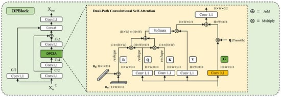 The overall structure of DPBlock and the principle of DPCSA. DPCSA consists of two branches, using a multi-head self-attention mechanism [18] and two-dimensional convolution to extract global and local features, respectively. Among them, the local features are weighted using the learnable parameter and then fused with the global features extracted by the self-attention mechanism.