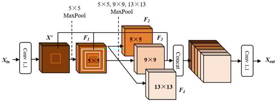where is defined as a 1 × 1 convolution with batch normalization and a SiLU activation function. Then, a 5 × 5 max pooling layer is applied to generate a finer max value feature representation . Based on this, a set of parallel pooling layers with pooling sizes of 5 × 5, 9 × 9, and 13 × 13 are concatenated to obtain different coarse max value features, represented as , , and , respectively. We set the output channel of all pooling operations to be consistent with the input, so . are defined as follows:
