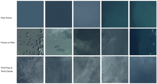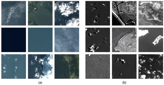 The LEVIR-ship dataset [17] is specifically curated for medium-resolution ORSSD with a resolution of 16 m. The dataset comprises 512 × 512-pixel Optical RSIS extracted from the GaoFen-1 and GaoFen-6 satellite imagery. With target ships typically smaller than 20 × 20 pixels, this dataset presents a challenge for detection algorithms. It encompasses 2320 images for training and an equal number of 788 images for both validation and testing purposes. Notably, LEVIR-ship includes a significant number of images with cloud interference, which adds to the complexity and realism of the dataset. This feature makes it more representative of real-world conditions compared to other datasets that are typically clean and cloud-free. Figure 6a shows sample images from the LEVIR-ship dataset, highlighting the presence of cloud interference and other challenging conditions.