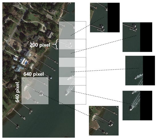 The DOTA dataset [46] is a large-scale benchmark for object detection in aerial images, containing diverse scenes captured from various platforms and sensors. It includes images with a wide range of resolutions and sizes, from 800 × 800 pixels to as large as 20,000 × 20,000 pixels. We extracted the samples containing ship targets from the DOTA dataset, cropped them into 640 × 640 images with a 200-pixel overlap, and re-labeled the annotations to create a new dataset named DOTA-ship, as shown in Figure 7. The dataset was then divided into training, validation, and testing sets in a 6:2:2 ratio, resulting in 2659 images for training, 886 for validation, and 886 for testing.