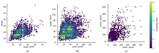 Distribution of ship label length and width in different datasets. Different colors represent varying probability values, with lighter colors indicating higher probabilities of ship label occurrence. (a) LEVIR-ship, (b) OSSD, and (c) DOTA-ship.
