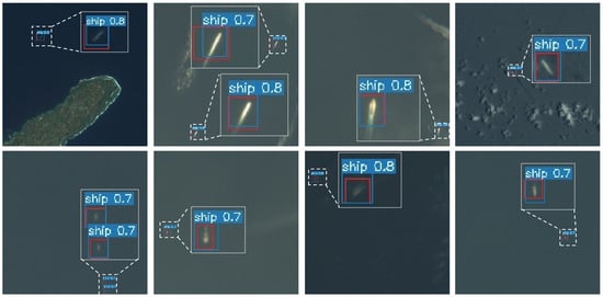 Some detection results of the proposed DPCSANet on LEVIR-ship. The red boxes represent the ground truth annotations, while the blue boxes indicate the predicted bounding boxes.