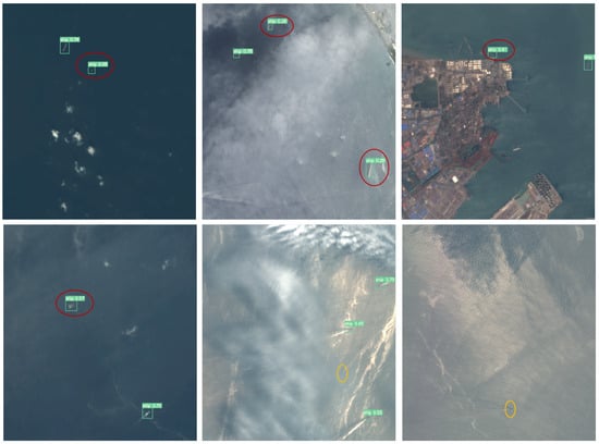 - False positive: False positives primarily occur in scenarios with significant background interference, such as cloud cover and fog. As shown in Figure 14, DPCSANet occasionally misclassifies fragmented clouds or ground structures covered by clouds as ships. This is particularly evident when these structures resemble the elongated shapes of ships. Additionally, narrow piers and other linear features in the image can also be mistakenly identified as ship targets due to their similar geometric properties. These errors arise because the model may learn to associate certain shapes and textures with ships, leading to misclassifications when similar patterns appear in the background.