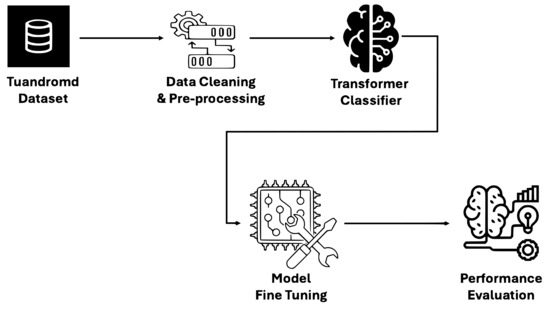 An overview of our methodology is shown in Figure 1. After cleaning and pre-processing the dataset, we divided the dataset into training and testing, following a 70–30% split, before applying the transformer classifier along with the other developed deep learning classifiers. Our choice for a 70–30% split was to ensure a balanced trade-off between model training and evaluation robustness. A 30% test set would allow a more comprehensive evaluation while reducing over-fitting concerns. Finally, we collected a variety of performance indicators to assess the effectiveness of our Trandroid approach. In the ensuing subsections, we will walk through the many technical aspects of our process.