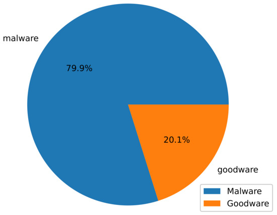 APIs are a core set of packages and classes generated by applications on operating systems to access data and interact with different parts of the device. The analysis report of these API calls allows the examination of the different applications’ behavior on the device, helping the authors categorize the applications as safe or malicious and generating a total of 54 API-based features. After pre-processing the raw data, a total of 8930 benign and malware applications have been reported. Figure 2 depicts the dispersion of the data between good-ware (benign) and malware.