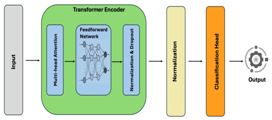 The architecture of our proposed transformer classifier is provided in Figure 4. The input layer obtained after the pre-processing phase projects the dataset features into a fixed size vector so that it can be adequate for the transformer encoder. The transformer encoder layer can be one or more, as needed, and its role consists of capturing the complex relationships between features. For our case, we chose one layer for the sake of not excessively increasing the model size, as this can incur some drawbacks with regard to performance. However, the encoder layer is, in turn, composed of several layer as follows. First, the multi-head attention mechanism provides the capability to capture the correlation between features in different spots of the sequence in parallel. Each self-attention layer is expressed by the following formula:
