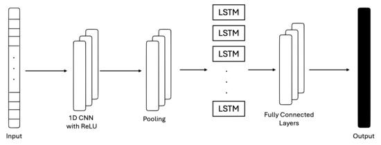 The CNN-LSTM final layer is formed by fully connected layers, used to detect intrusions over certain periods of time. The output of the LSTM unit is flattened into a feature vector , where l represents the number of units in the LSTM unit, as shown in Equation (19).