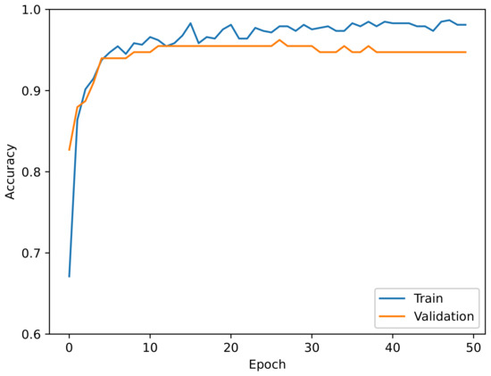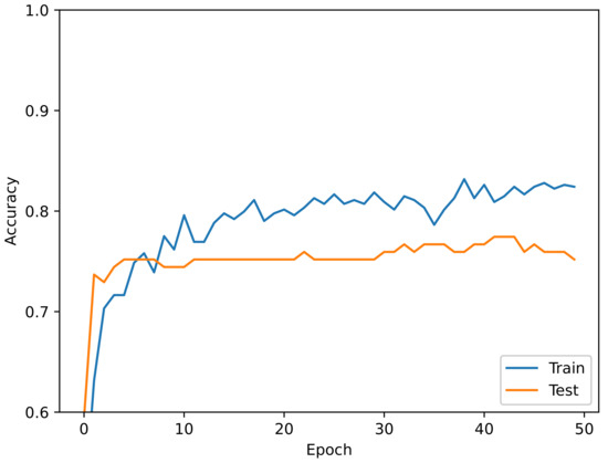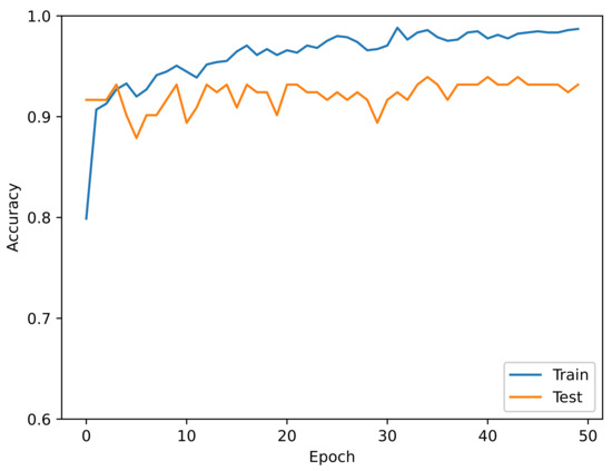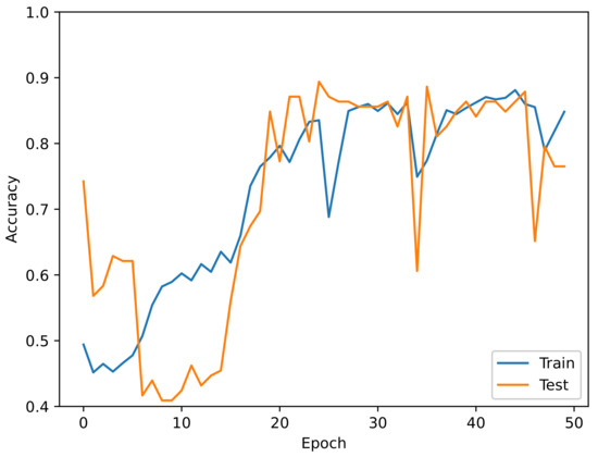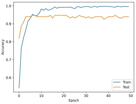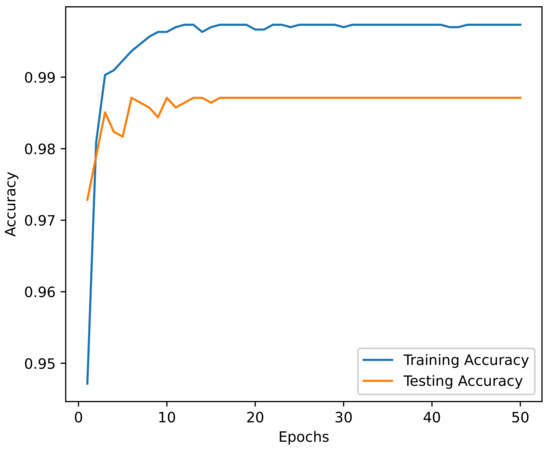 The LSTM classifier scored a 93.98% accuracy. We opted for the Keras sequential model with two dense layers. The first layer acted as the input layer, and it had 64 neurons and tanh as activation function. The second layer, which was the same as the output layer, had one neuron and a Sigmoid activation function. The model was compiled using 50 epochs and a batch size of 32, with an overall time of 12.88 s. The accuracy plot of the classifier for the training and testing is displayed in Figure 14. We chose LSTM due to its ability to capture long-term dependencies, its robustness to noise, flexibility in handling sequences of varying lengths, and its capability for automatic feature learning.