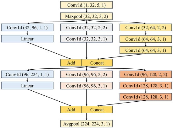 In time-dependent feature branch, each 1D convolutional tunnel processes a single sensor signal. It is designed to capture dependencies of temporal signal using multiple convolutional kernels of different sizes, which is similar to inception module. The 1D-CNN structure of a single tunnel is shown in Figure 4. The shape of the input tensor is batch × 1 × 25, where 25 represents the number of sample points. As shown in Figure 4, the convolutional network contains branches with convolutional kernels of different sizes to capture temporal dependencies at different scales. The final size of the vector of the 1D-CNN block is 4032, with each tunnel’s vector of size 224 concatenated. There is a BN layer and a ReLU layer following each convolutional layer. When the feature map sizes do not match, a linear layer would be added for dimensional adjustment.