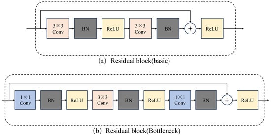 ResNet-18 is a deep convolutional neural network famous for image classification within the Residual Network family. Authors resolved the degradation problem of deep convolutional neural networks by introducing residual connections, with “18” indicating the network’s depth of 18 layers. ResNet is composed of multiple stages, each consisting of several residual blocks. The feature map’s channel dimensions only change when feature map size is changed to preserve the time complexity. The basic structure of the residual block is shown in Figure 5 and consists of a 3 × 3 convolutional layer, a BN layer, and ReLU. Due to computational constraints at the time, two 1 × 1 convolutional layers were added to the basic residual block, forming the Bottleneck residual block. This design reduces the channel dimensions of the feature map before increasing them again, reducing intermediate computation costs. The reason for using ResNet-18 as the backbone is that compared to deeper variants of ResNet (ResNet-34, ResNet-50, ResNet-101, ResNet-152), its performance in the fusion model does not significantly improve. However, as the network deepens, the number of parameters that need to be trained increases exponentially.