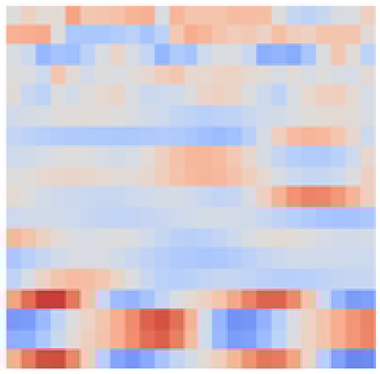 In the heatmap feature branch, the input is a heatmap image of multi-sensor signals, forming RGB images with dimensions of 3 × 224 × 224 in tensor format. The heatmap represents the values of multi-sensor signals after normalization, with the columns corresponding to the time axis of the sensor data. Specifically, each rectangular color block on the y-axis of the heatmap represents, from top to bottom, x-, y-, and z-axis acceleration; x-, y-, and z-axis angular velocity; and x, y, and z foot-end velocity, totaling 18 rows. The x-axis represents the time axis, with a total of 25 time points. Using the heatmap as input not only allows for the extraction of temporal features from each signal but also enables the capture of dependencies between different signals due to the nature of 2D convolution. Using the heatmap as input not only allows for the extraction of temporal features from each signal but also enables the capture of dependencies between different signals due to the nature of 2D convolution. Additionally, a part of the motion pattern information is reflected in the heatmap. As shown in Figure 6, when the quadruped robot walks in a straight line, the last four rows of the heatmap resemble the gait planning of the robot, and these last four rows correspond exactly to the robot’s foot speed in the x-direction (forward and backward direction).