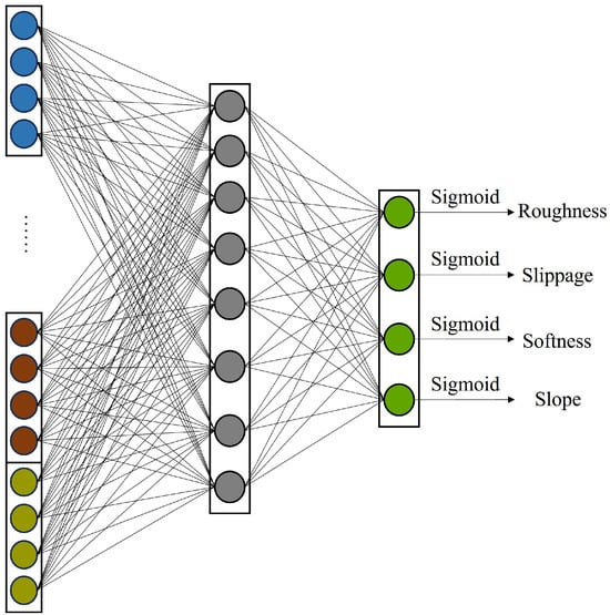 The flat terrain with the “0000” label represents the optimal condition terrain. The uneven terrain with the “1000” label represents rough terrain but with optimal conditions in other terrain characteristics. The slippage terrain with the “X1XX” label represents the snowy terrain or sandy terrain. In “X1XX” label, “X” represents the uncertainty about terrain characteristics because of the fluidity of snow and sand terrain. Due to the particularities of snowy and sandy terrain, it is difficult to precisely define the roughness and slope of fluid terrain based on personal judgment. However, there are common characteristics of terrains with fluid properties like slippage and softness. Due to weather and humidity factors, the hardness on snowy and sandy terrains is not even during the experiment. To be cautious, only slippage was used as the definitive label. During the training process, the masked labels output the forward propagation results but did not participate in the backpropagation process. During the validation and testing phases, the masked labels output inference results, but their results were not included in the statistical results. Therefore, in this study, the label X is neither 0 nor 1, indicating an uncertain ground condition. The soft terrain with the “0010” label represents grass terrain and soft carpet terrain. The slope terrain with the “0001” label represents slope terrain but with optimal conditions in other terrain characteristics. Specific dataset information is provided in Table 1.