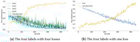 In Equation (4), y represents the predicted value, y* is label value, j denotes the j-th training sample in the training set, and i is the i-th label head. The binary cross-entropy loss function is backpropagated separately for each label within an episode, meaning that a batch of data is utilized multiple times, thereby increasing data usage efficiency. Moreover, this approach prevents the algorithm from using the loss of one label head with a larger loss to train another label head that already performs well. The comparison chart of training using the traditional backpropagation strategy, and the new backpropagation strategy is shown in Figure 8. Figure 8a shows the loss and accuracy changes on the validation set for a model where four label heads perform backpropagation separately within a single batch. Since both the loss and precision values range from 0 to 1, they share the same axis. It is clearly observed that the accuracy and loss of the four label heads stabilize around episode 400. In Figure 8b, the accuracy and loss changes using the traditional backpropagation strategy are shown. It can be observed that on the same dataset, the model has not yet reached a convergent state.